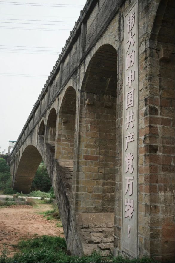 东风渡槽则以80米主拱跨径的雄姿,定格了1972年“全省之最”的荣光。东风渡槽的拱形结构,借鉴了古代石拱桥的营造法式,160米的槽身如巨龙腾跃,17跨拱券次第展开,每一道弧线都暗合力学之美。钢筋混凝土的矩形槽身则以精确的1/1000比降,让每秒33立方米的激流驯服地奔向远方。西北、东南两向正中的“东风渡槽”匾额,在阳光下闪耀如勋章,两侧具有时代特色的标语至今振奋人心:“水利是农业的命脉!备战、备荒、为人民!”这些文字与建筑本身共同构成了一部立体史书,记录着那个激情燃烧的年代里,建设者们如何用钢钎、箩筐和算盘,在峡谷间架起这座不朽的“水利长城”。