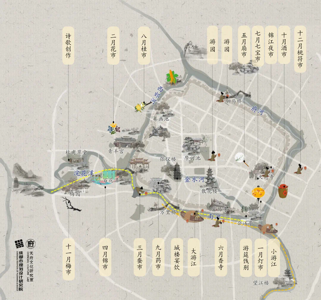 在浣花溪流觞赋诗,在张仪楼、万里桥送别友人,在望江楼登楼怀古,成都水脉成为城市文化地标。