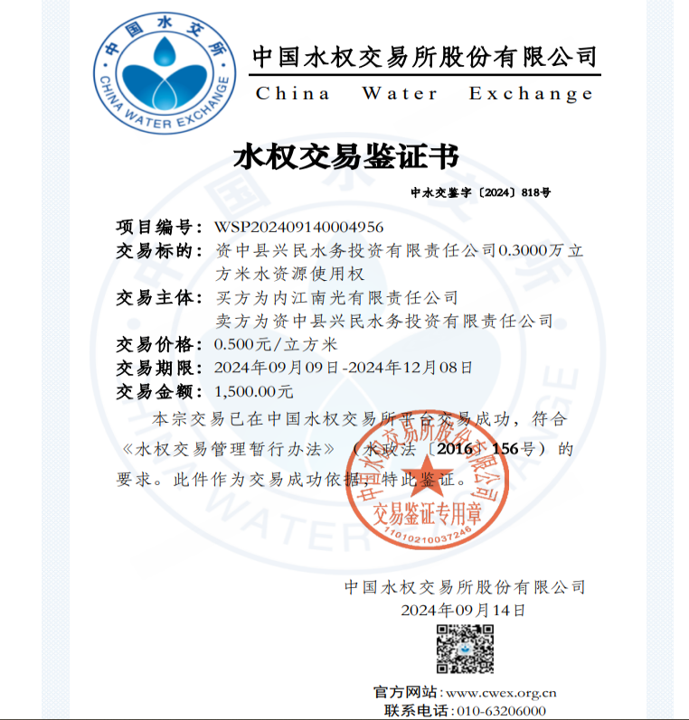 2024年9月14日,资中县兴民水务投资有限责任公司将节约的水权指标0.3万立方米售予用水紧张的内江南光有限责任公司,交易金额1500元,完成资中县首例水权交易,促进了水资源集约节约利用,标志着资中县水权交易实现突破。