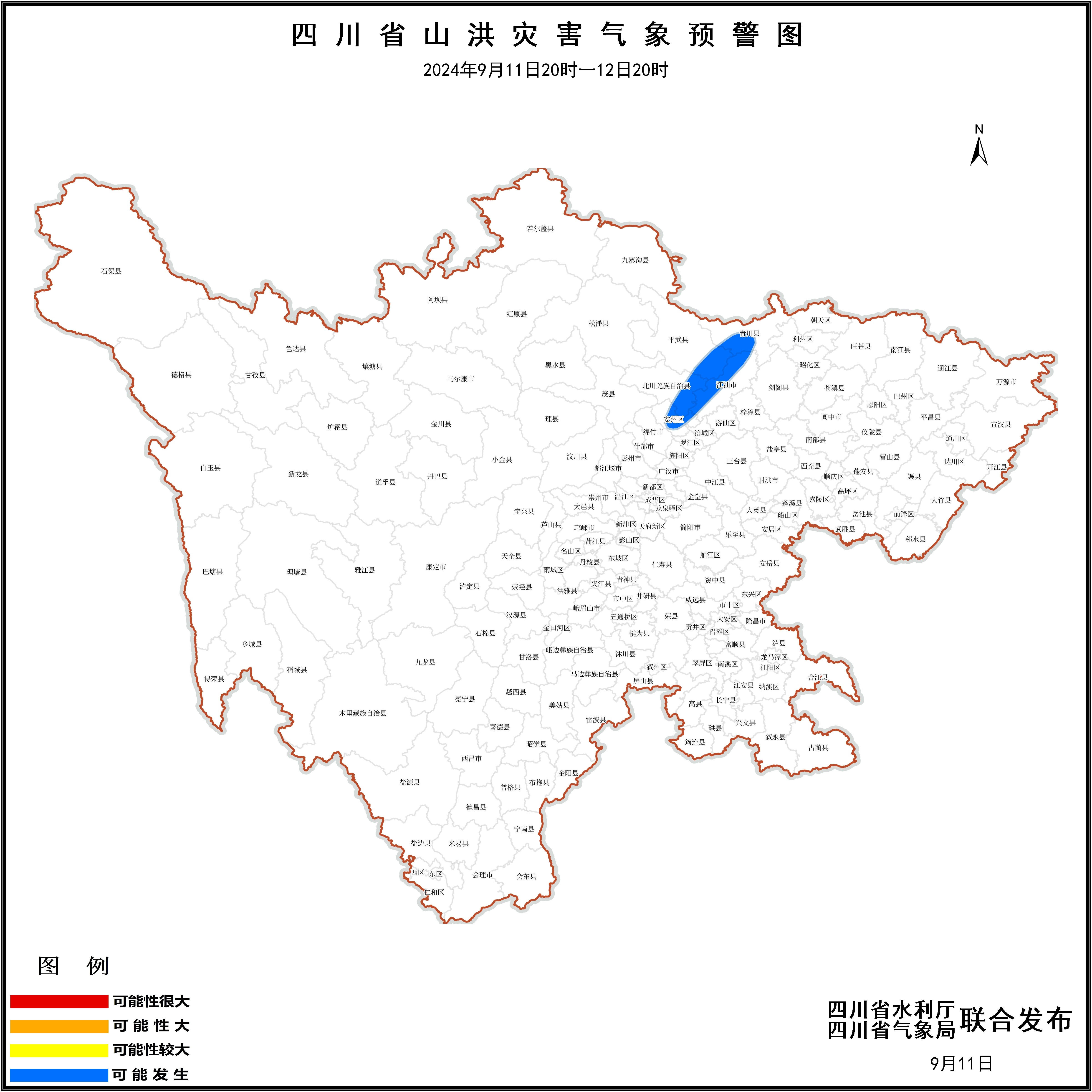 2024年9月11日20时至12日20时,绵阳市安州、北川、平武、江油,广元市青川等5个县(市、区)可能发生山洪灾害。
