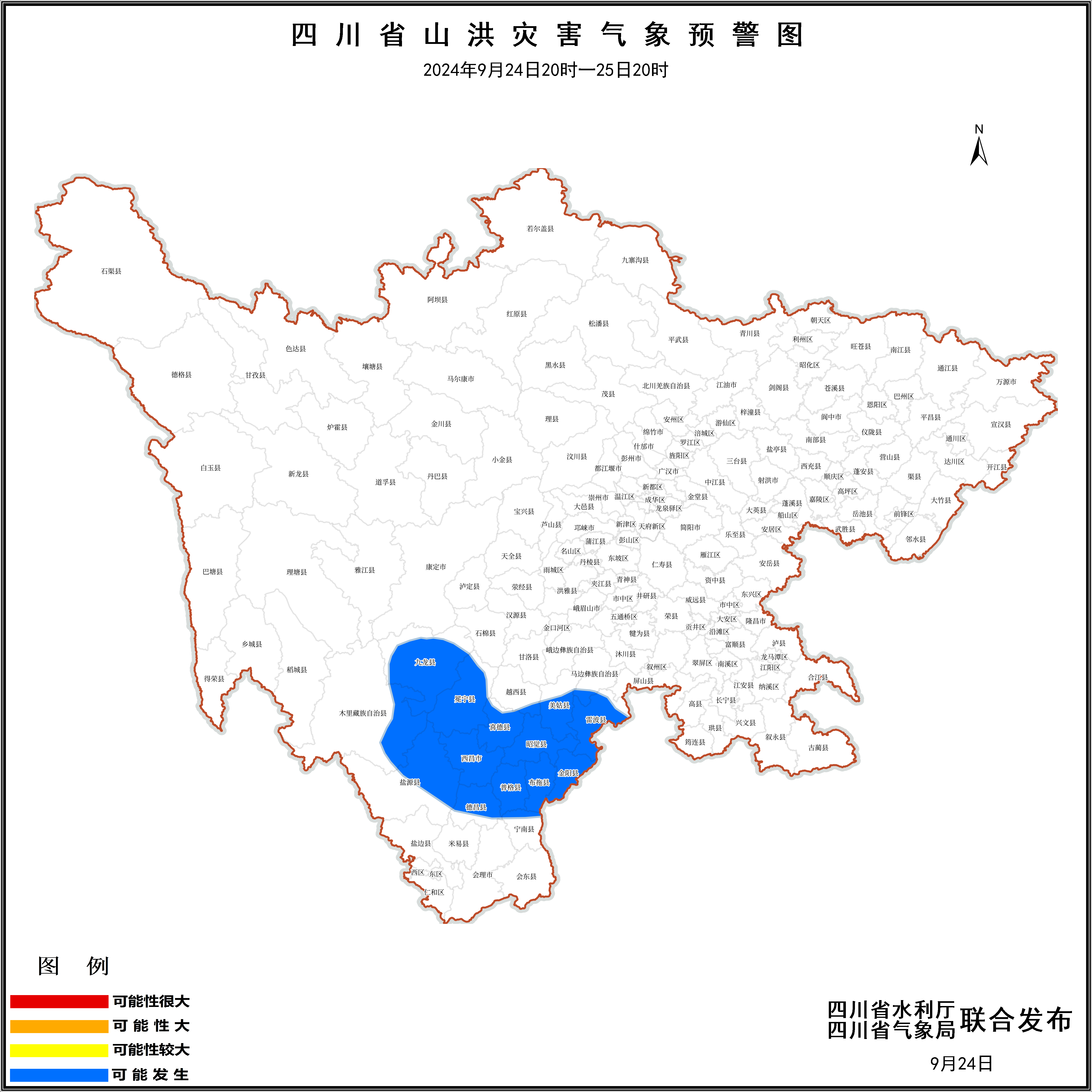 2024年9月24日20时至25日20时,乐山市马边,甘孜州九龙,凉山州西昌、木里、盐源、德昌、宁南、普格、布拖、金阳、昭觉、喜德、冕宁、越西、美姑、雷波等16个县(市、区)可能发生山洪灾害。