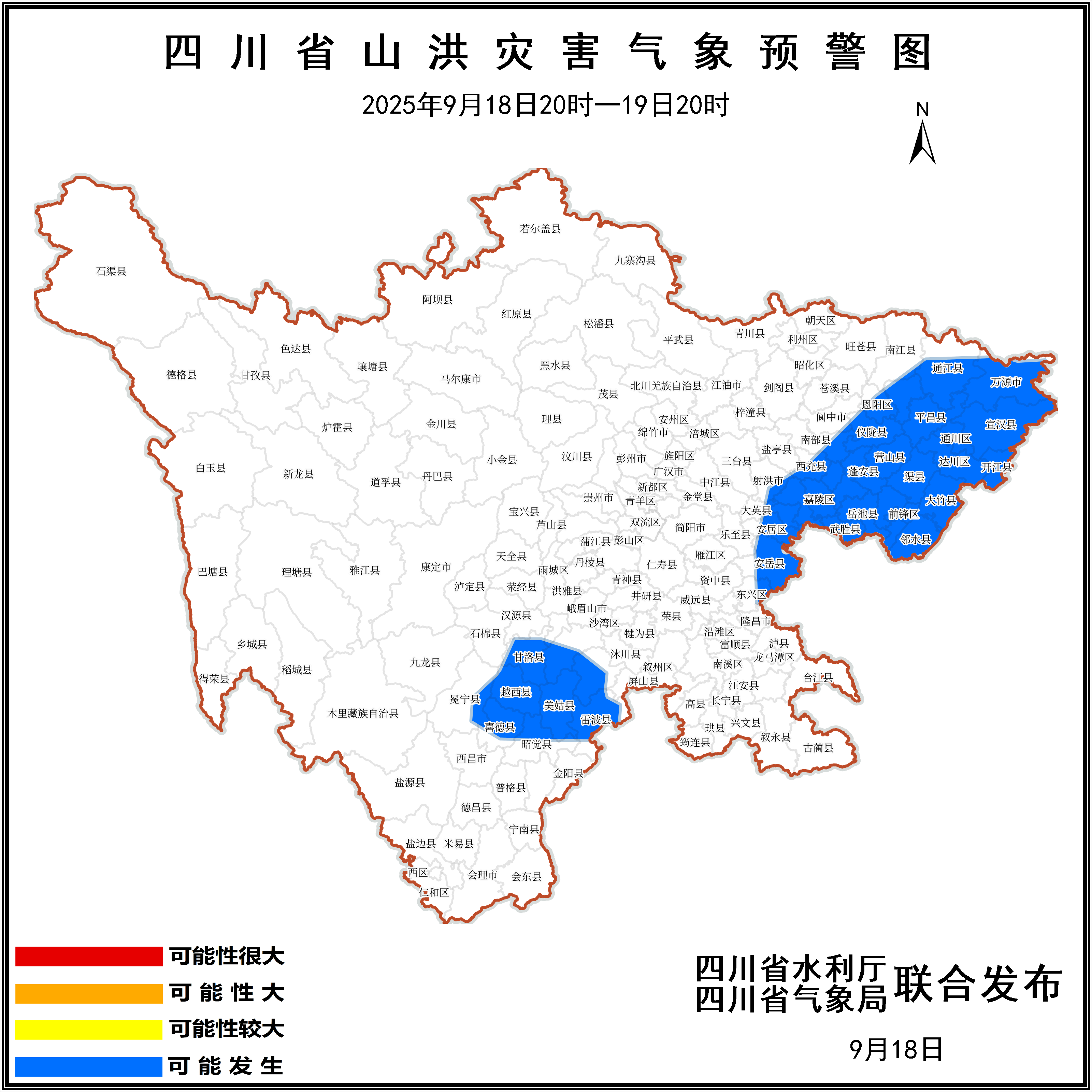 2025年9月18日20时至19日20时,达州市宣汉、通川、达川、渠县、万源、开江、大竹,广安市广安、岳池、武胜、华蓥、邻水、前锋,南充市营山、蓬安、顺庆、仪陇、嘉陵、高坪、西充、南部、阆中,巴中市平昌、巴州、通江、恩阳、南江,遂宁市蓬溪、船山、安居、大英、射洪,资阳市安岳、乐至,内江市东兴,凉山州越西、雷波、喜德、昭觉、甘洛、美姑、冕宁,乐山市马边、峨边、金口河,雅安市汉源等10个市(州)46个县(市、区)可能发生山洪灾害。