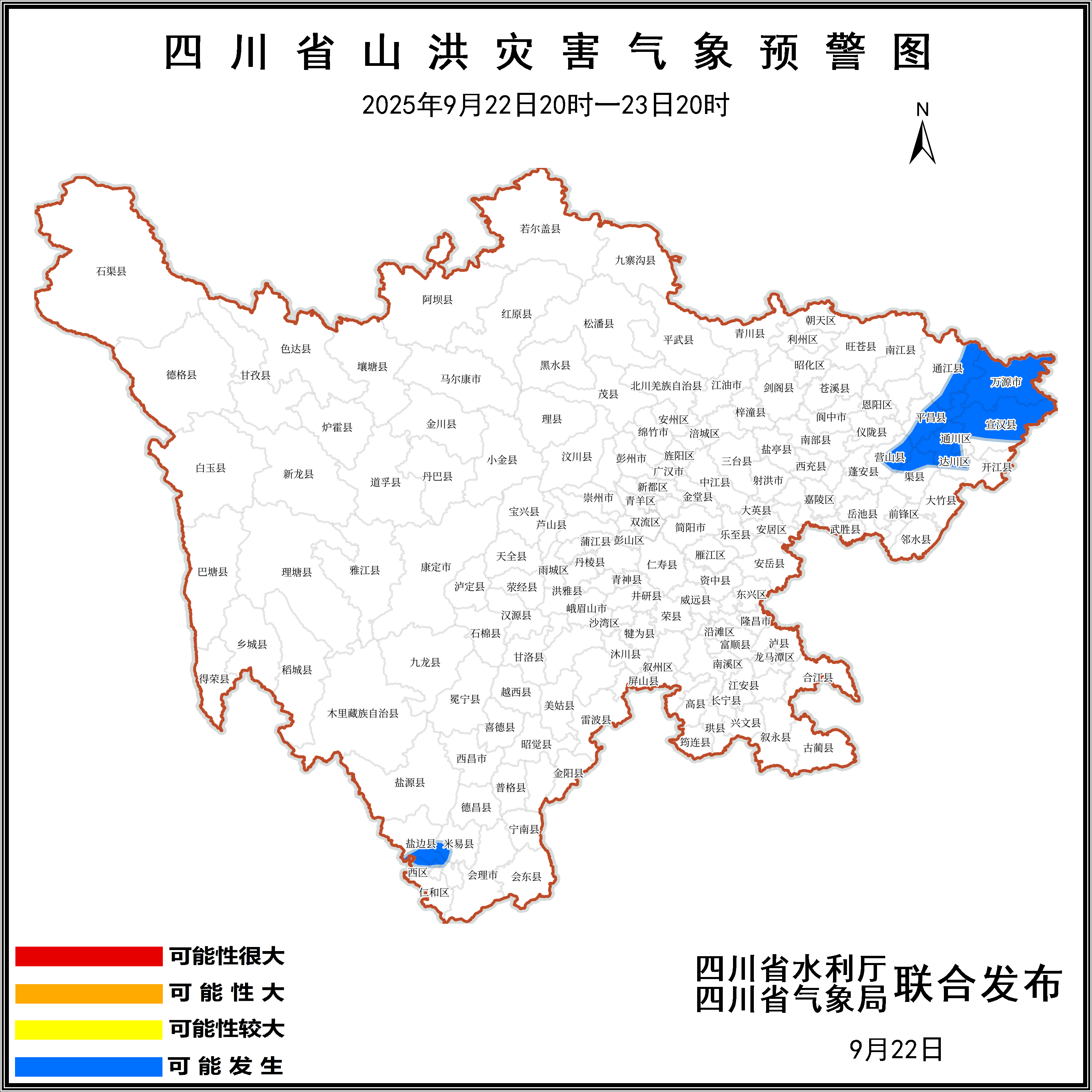 2025年9月22日20时至23日20时,达州市万源、宣汉、通川、达川、渠县,巴中市平昌、通江,攀枝花市仁和、米易、盐边,南充市营山等4个市(州)11个县(市、区)可能发生山洪灾害。