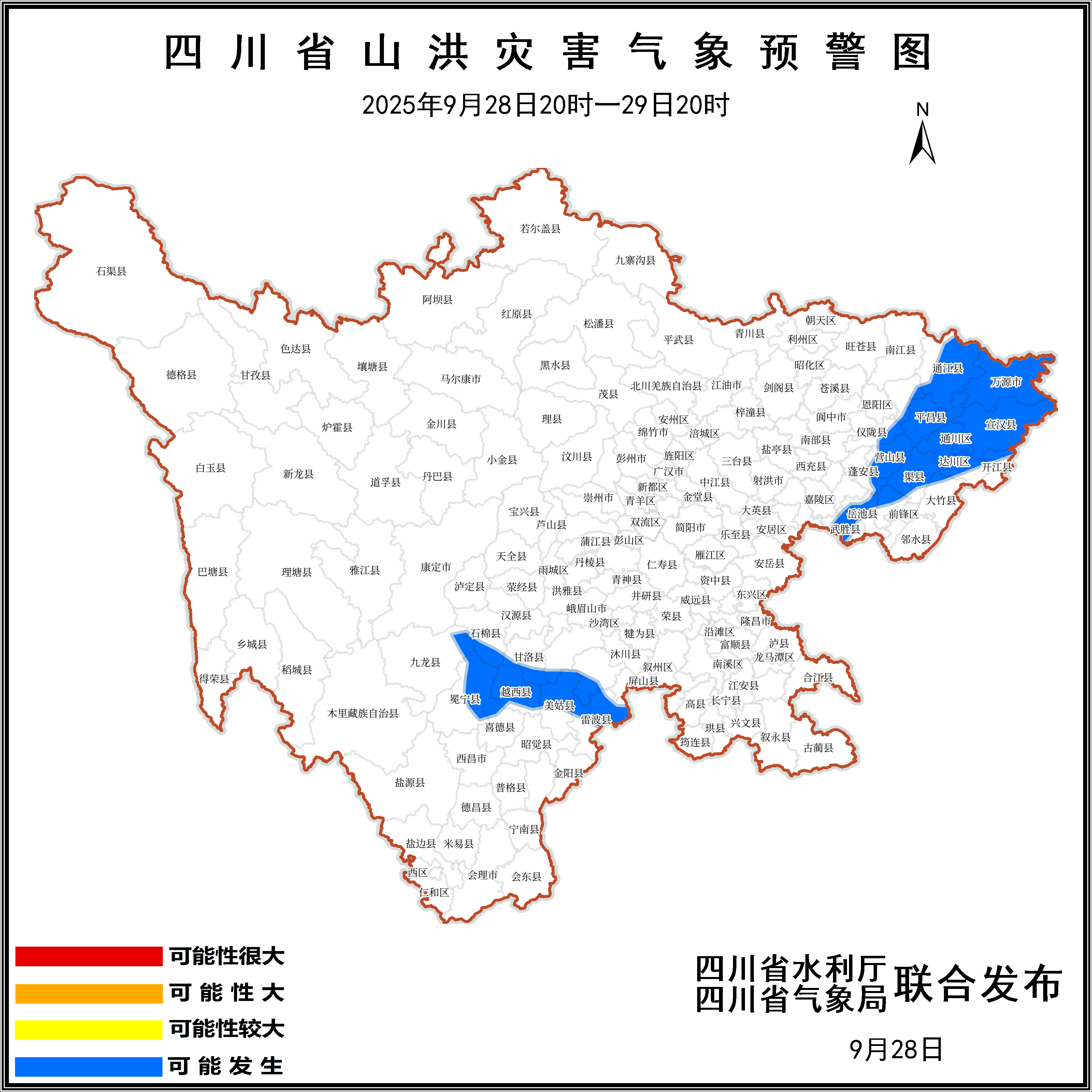 2025年9月28日20时至29日20时,达州市万源、宣汉、通川、渠县、达川、开江、大竹,巴中市平昌、通江、巴州,广安市岳池、武胜、广安,南充市营山、蓬安、仪陇,乐山市马边、峨边,凉山州越西、冕宁、雷波、美姑、甘洛、喜德,雅安市石棉,甘孜州九龙等8个市(州)26个县(市、区)可能发生山洪灾害。
