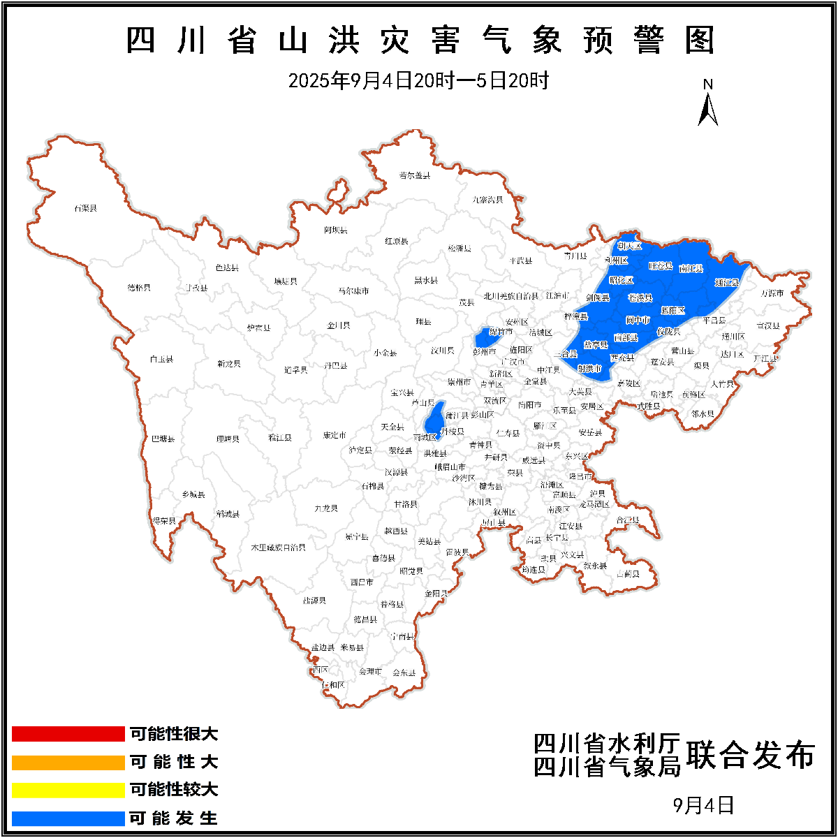 2025年9月4日20时至5日20时,广元市苍溪、旺苍、昭化、剑阁、朝天、利州,巴中市恩阳、南江、通江、巴州、平昌,南充市阆中、南部、西充、仪陇,遂宁市射洪、蓬溪,成都市彭州、邛崃,德阳市什邡、绵竹,绵阳市盐亭、梓潼、三台,雅安市名山、雨城,眉山市丹棱、洪雅等9个市(州)28个县(市、区)可能发生山洪灾害。