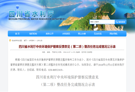中央环境保护督察反馈意见(第二项)整改任务完成情况公示表》等十余条相关信息。配合生态环境厅编制《四川省生态环境监测网络建设总体规划》,报送水资源及水保监测的子规划并对总体规划提出修改意见。