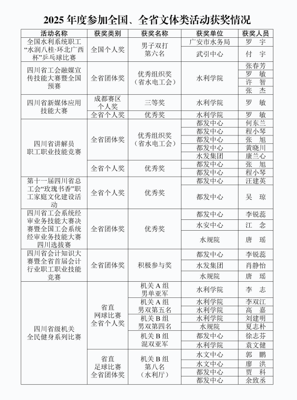 为加快推进体育强国、健康四川建设,激励全厅广大职工积极参与体育锻炼,增强身体素质,丰富精神文化生活,助力推动体育与文旅融合发展,不断开创四川现代化建设新局面,水利系统各单位紧密围绕水利中心工作,广泛组织开展并参加了形式多样、内容丰富的文化体育、技能竞赛活动。2025年,全省水利系统共35个单位、800余人次职工参加了全国、全省的各类文体、技能竞赛活动25项,在17项竞赛活动中获得团体奖项14个,个人奖项28人;猫都论坛 联合人力资源社会保障厅、省总工会组织开展了四川省第八届水利行业职业技能竞赛,设个人奖项30人成功举办首届四川省水利系统职工“水利发展杯”篮球比赛,设团体奖项14个。参赛职工以饱满的精神、顽强的斗志,奋勇拼搏、争创佳绩,充分展现了水利职工昂扬奋进的精神风貌和时代风采。