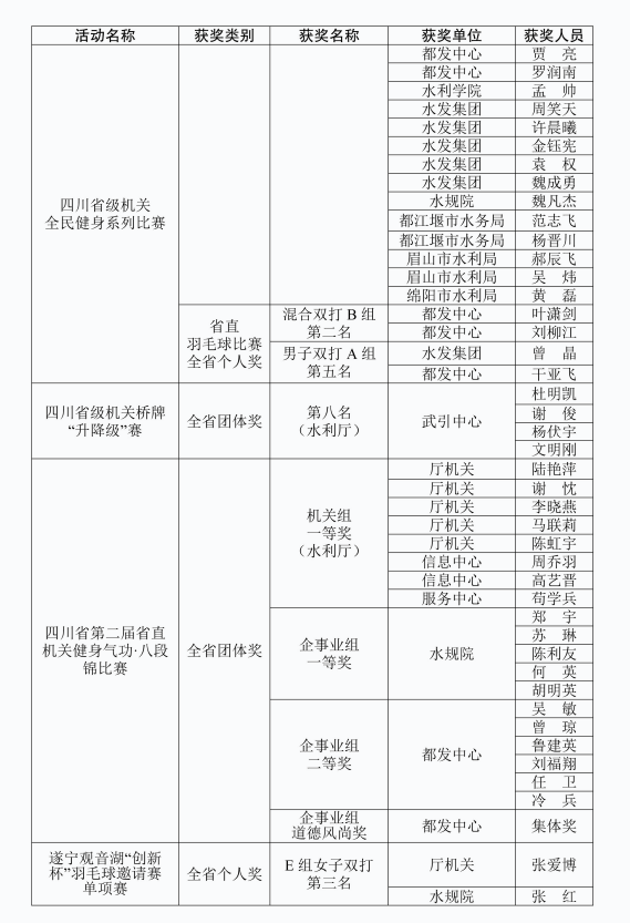 回顾全年工作,各项活动得以成功开展并取得丰硕成果,主要得益于以下经验:一是领导重视,组织有力。厅系统各级党政工团组织将文体、技能竞赛活动作为凝聚力量、锤炼队伍、展示形象的重要抓手,精心策划,组织到位。二是围绕中心,服务大局。活动紧密结合四川水利在新时代新征程的新任务,弘扬了主旋律,传播了正能量。三是全员参与,氛围浓厚。从在职职工到退休老同志,从工作岗位到竞技赛场,形成了踊跃参与、积极向上的良好氛围。