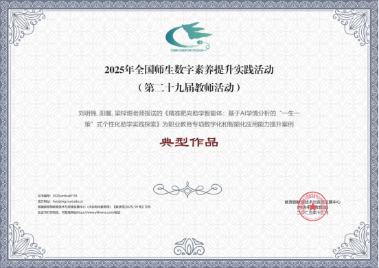 12月29日,教育部教育技术与资源发展中心(中央电化教育馆)发布2025年全国师生数字素养提升实践活动(第二十九届教师活动)参与情况总结。四川水利职业技术学院报送的案例《精准靶向助学智能体:基于AI学情分析的“一生一策”式个性化助学实践探索》,凭借在职业教育领域中AI赋能、数据驱动与个性化助学的创新应用实践,荣获本年度职业教育专项“数字化和智能化应用能力提升典型案例”。